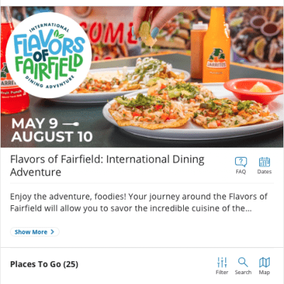 This mobile exclusive pass is a collection of international restaurants for you to enjoy throughout the city of Fairfield!