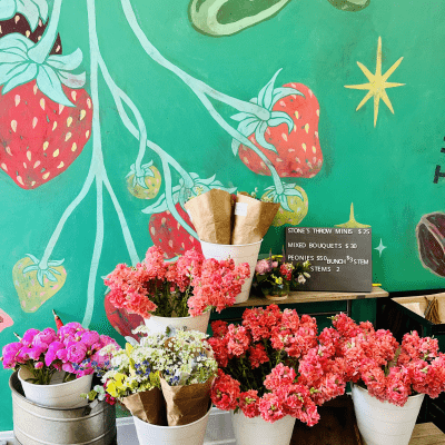 Artist Jenn Acus-Smith of Bright Wall Collective designed and painted the beautiful floral mural that can be seen as you enter The Farmer's Collective.