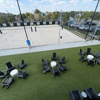 And if you’re more of an outdoor recreational seeker, you’ll find five sand volleyball courts, table tennis, cornhole, and a huge green space perfect for events or just lounging. There’s plenty of indoor and outdoor seating — patios on the first floor, a second-floor deck with a view, and cozy corners everywhere in between.