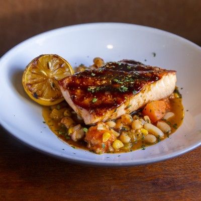 Caruso’s pan-seared salmon is a perfect balance of crispy, golden perfection and tender, flaky goodness. Served over a rich and creamy parsley and Parmesan risotto, this dish is elevated by a vibrant roasted tomato basil relish, adding a fresh and savory touch to every bite. A true indulgence for seafood lovers.