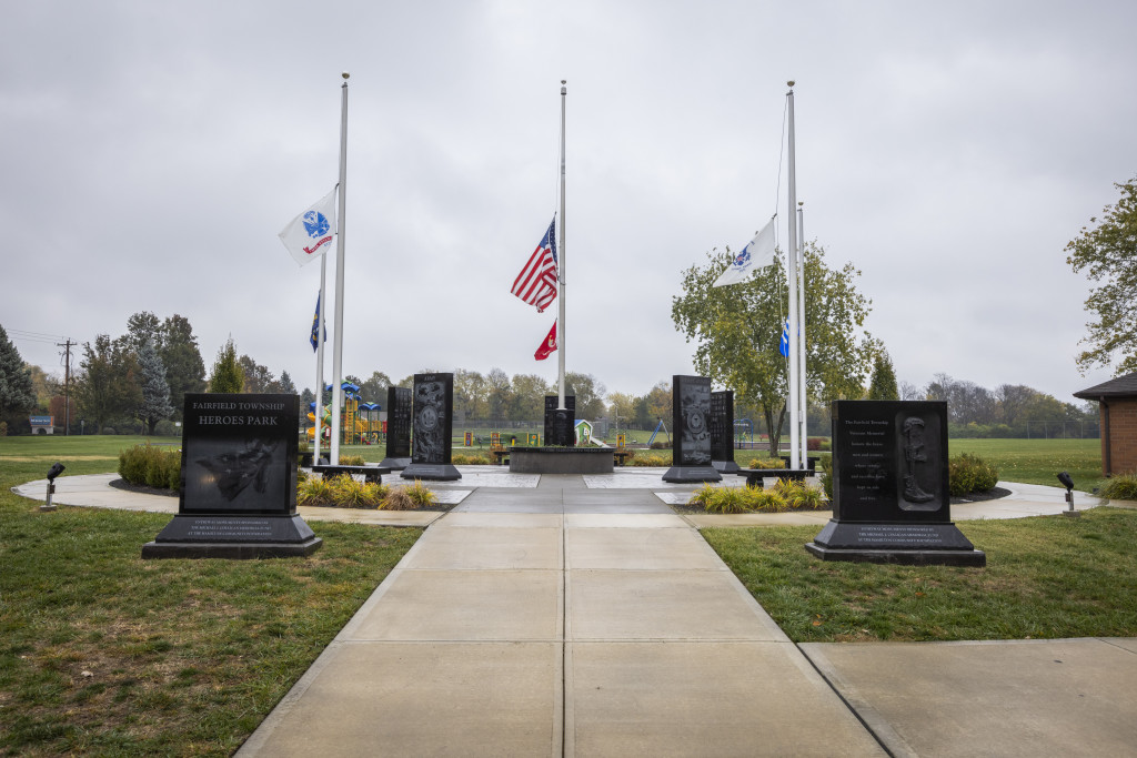 There is also a large veteran memorial located at the entrance to the park. These granite monuments recognize each branch of service, etched with a patriotic scene on one side, and serve to honor the sacrifices made by the armed forces.